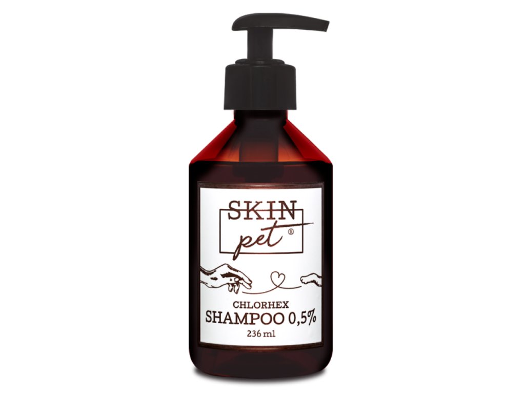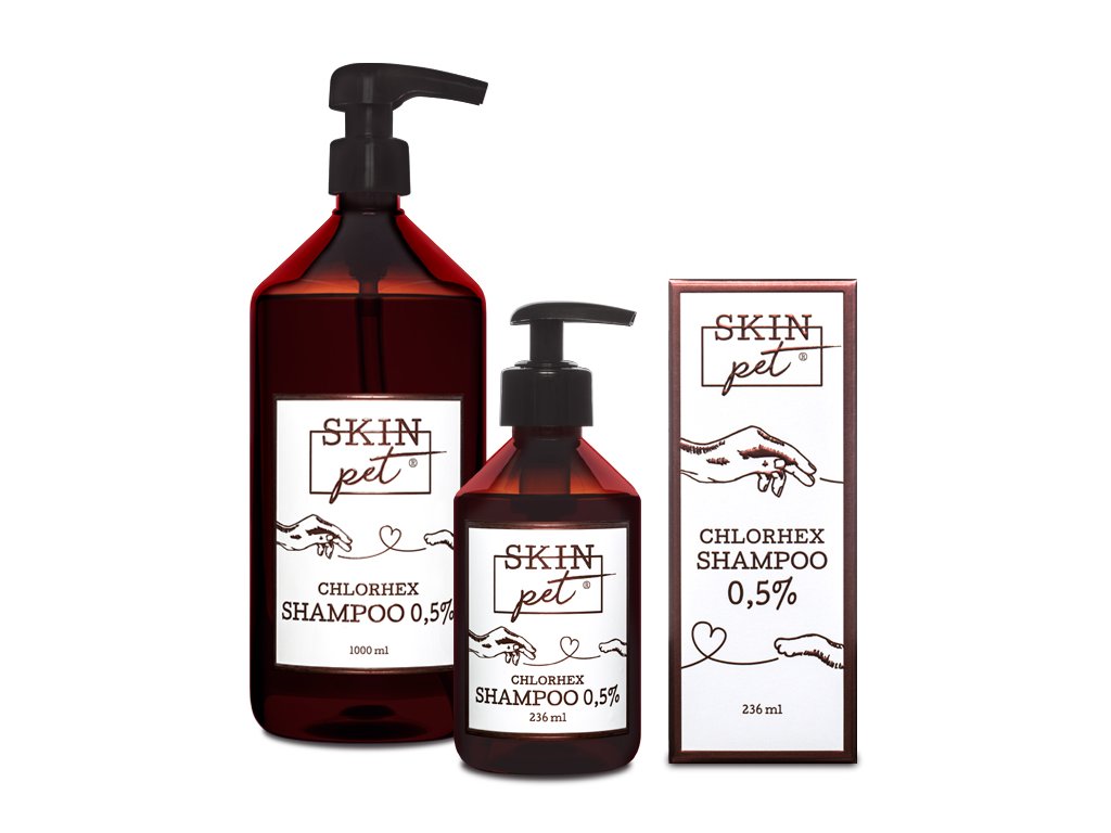 Antiseptický šampón pre psy a mačky SkinPET® Chlorhex Shampoo 0,5% je  starostlivosť o pokožku a srsť vášho maznáčika. Antiseptické látky znižujú množstvo baktérií a kvasiniek, ktoré kolonizujú na koži. Odstraňuje nečistoty, odumreté tkanivo, zaschnutý hnis aj krv - to je všetko je živnou pôdou baktérií a plesní. Šampón pomáha tiež pri upokojení podráždenej, citlivej svrbivej pokožky. Neobsahuje alergie. Vďaka šetrnému zloženiu na pokožke neštiepe a nedráždi.